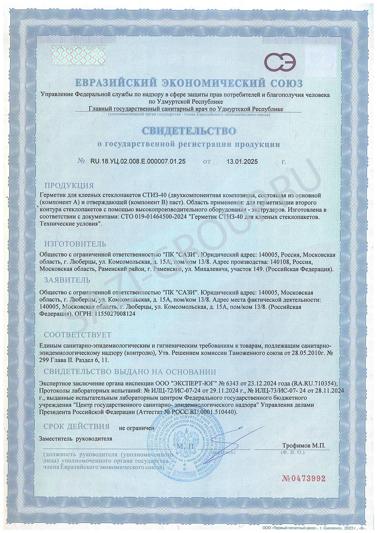 • Свидетельство о госрегистрации Свидетельство о госрегистрации Сазиласт 24 Комфорт Свидетельство о госрегистрации Сазиласт 24 Комфорт